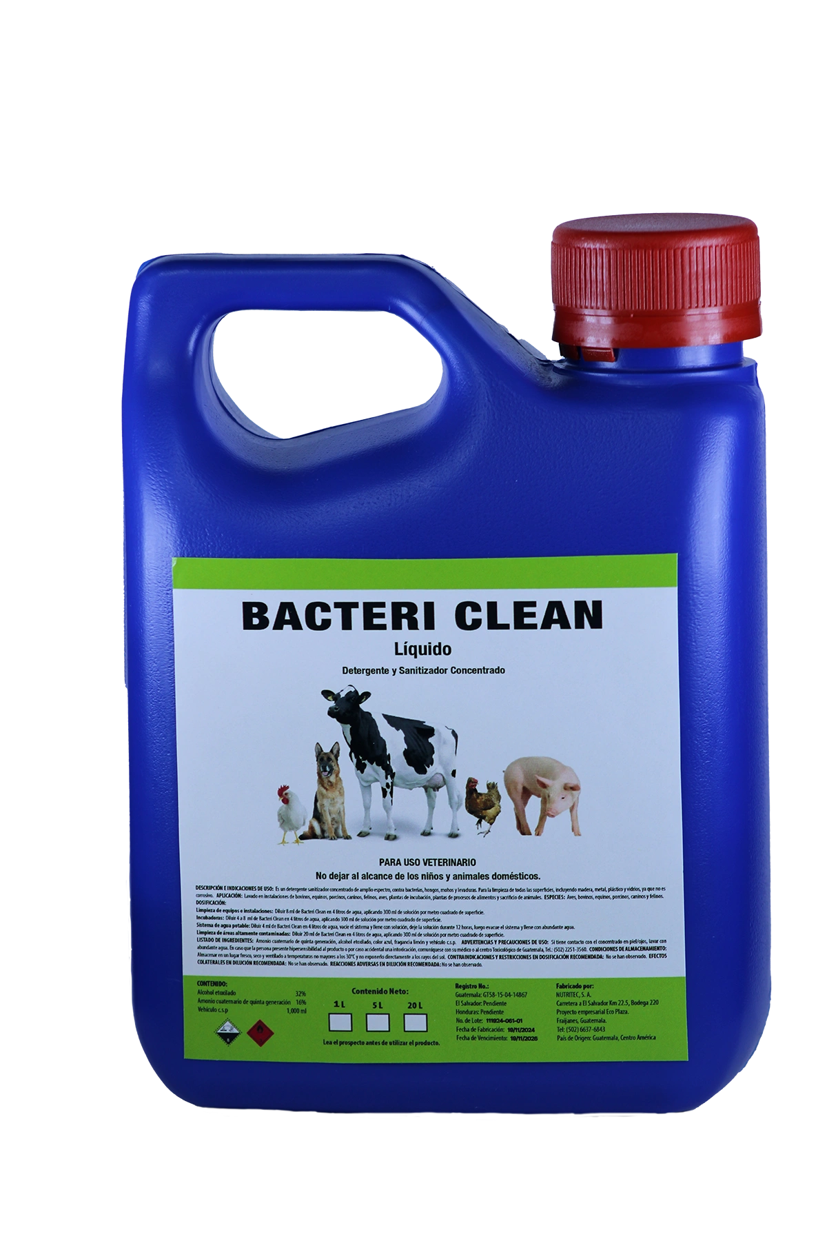 Detergente altamente concentrado y sanitizante en solución, con acción biocida de amplio espectro. Bactericida y fungicida de uso externo para la limpieza y desinfección terminal de instalaciones tales como: galpones, incubadoras, salas de ordeño, cristalería, perreras, laboratorios, equipos, sistemas de agua y todas las superficies incluyendo madera, metal, plástico y vidrios. Ya que no es corrosivo.