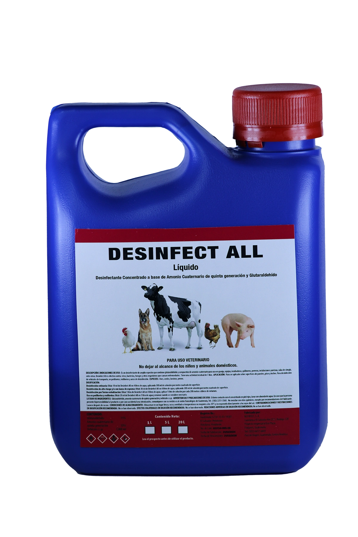 Desinfectante en solución altamente concentrada, formulado especialmente con glutaraldehído y amonio cuaternario de quinta generación para garantizar la desinfección en granjas, galeras, rastros, incubadoras, equipos, criaderos de animales, laboratorios, perreras, clínicas veterinarias, arcos de desinfección, vehículos ganaderos, etc.