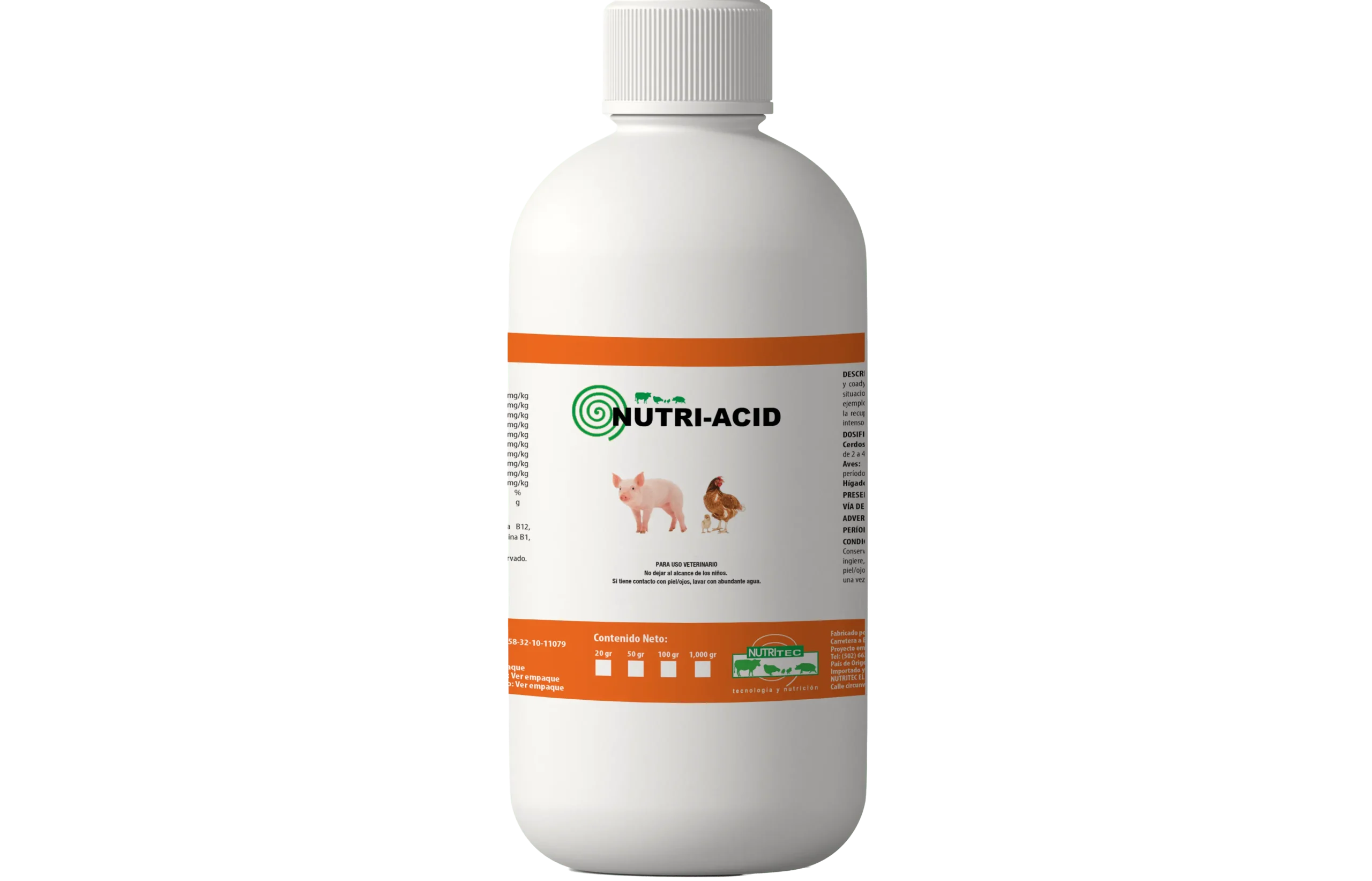 Mezcla de ácidos que mejora la digestión en animales jóvenes. Compensa la falta de ácido clorhídrico estomacal, controla bacterias intestinales y elimina biofilm en tuberías.